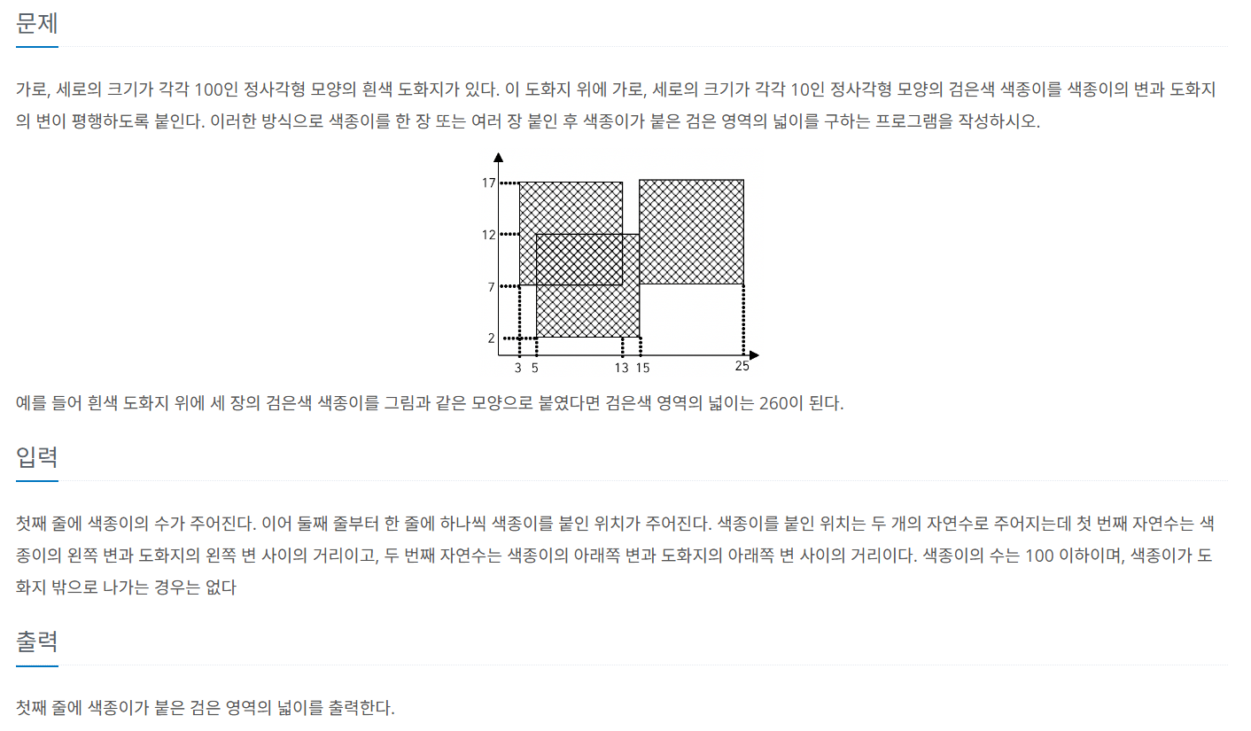 이 문제는 2차원 행렬을 이용하여 푸는 문제이다. 2차원 행렬을 0으로 초기화 한 후, 검정색 색종이가 있는 부분을 1로 할당한다. 그리고 2차원 행렬의 합을 구하면 이 문제는 해결된다. 이렇게 구하면 겹치는 부분을 신경 쓸 필요 없이 검은 영역의 넓이를 구할 수 있다.
