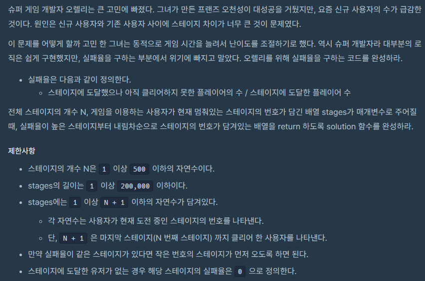 말 그대로 각 스테이지의 실패율을 구해서 실패율이 큰 스테이지 번호 순서대로 추출하는 문제였다.